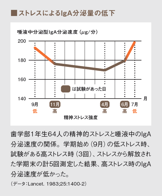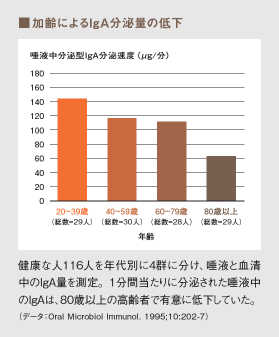 免疫細胞によって作られる「免疫グロブリンA(IgA)」は、体外と体内を隔てる粘膜面で病原体の体内への侵入をブロックするという、感染症予防に重要な役割を担っています。IgAは、IgGなどと比較して抗原特異性が低く、様々な病原体に結合できるため、全身の粘膜面において細菌やウイルスなどの病原体の体内への侵入を防いでくれます。IgAの分泌量が増えることは、様々な感染症予防に寄与すると言えます。逆にIgAの分泌量が少ない場合には、病気や風邪になるリスクが高まります。IgAの分泌量は、加齢やストレスによって低下します。